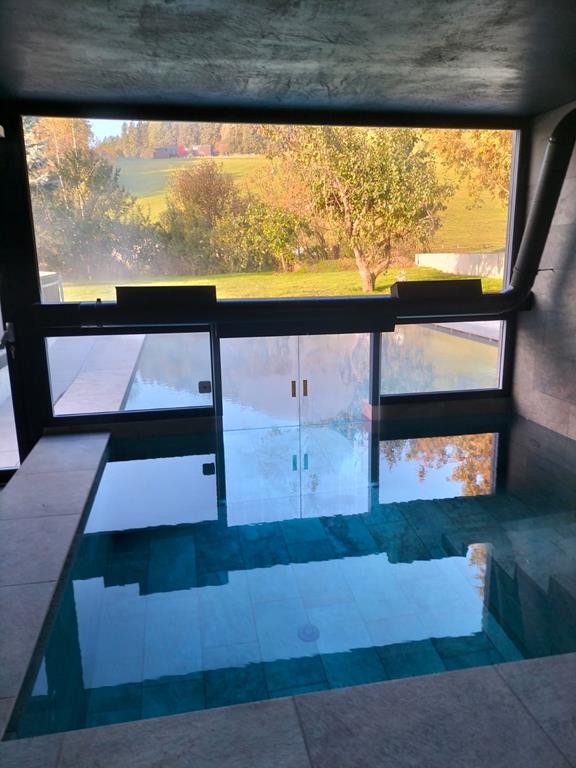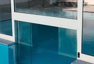 La tecnologia degli automatismi DORMA permette la loro installazione in acqua per passaggio tra interno ed esterno di una piscina o per separare in modo elegante le zone di un centro benessere.